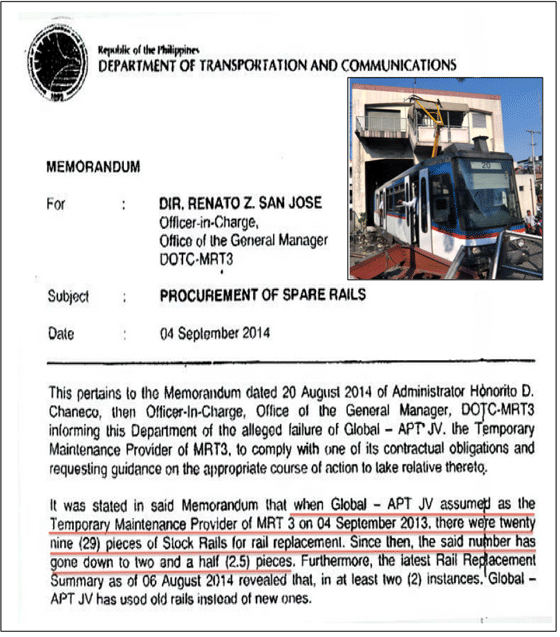 One evidence of this is a September 4, 2014 report to the DOTC official in charge of the MRT-3, Renato San Jose, which read: