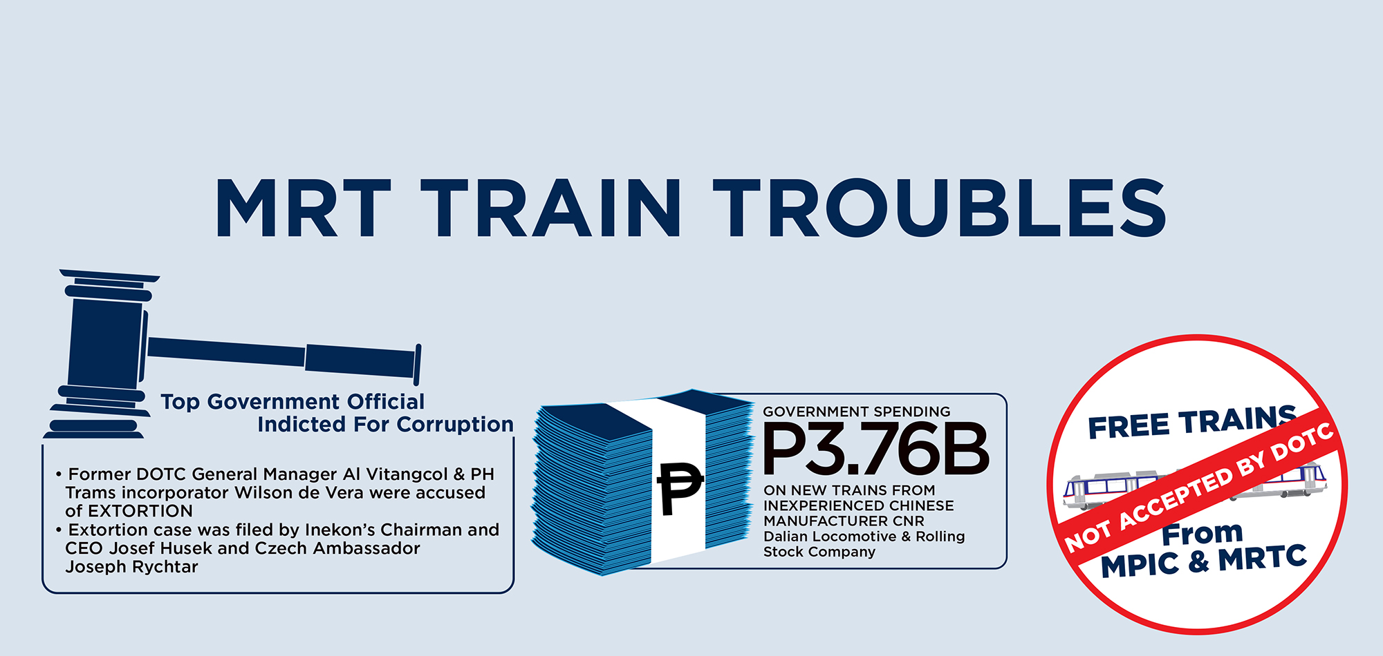 | GOVERNMENT CORRUPTION • Alleged attempted extortion of $30M for MRT expansion deal on July 9 & 10, 2012 • Czech Ambassador Joseph Rychtar filed the case against the DOTC's former General Manager Al Vitangcol • Accused Liberal Party candidate Wilson de Vera was one of PH Trams' incorporators |