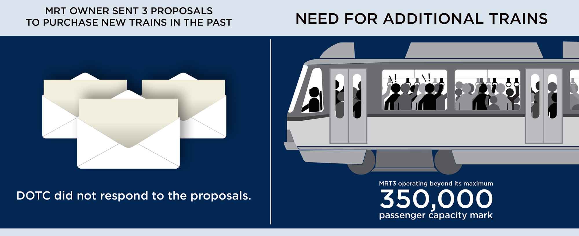 • MRTC forecasted a breach in the system's capacity in 2002 • MRTC repeatedly sent proposals in years 2002, 2004, and 2007 for the purchase of Light Rail Vehicles (LRVs) • DOTC did not respond to any of the proposals |